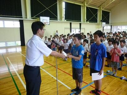全校集団下校では「あいさつ名人」を1~5年生から選び、毎月の全校朝会では「あいさつ隊長」を6年生から選んでいます。