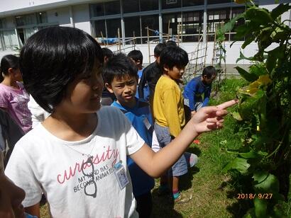 この日の学習問題は、「ヘチマやカボチャのおばな、めばなはどのようなつくりになっているのだろうか?」です。早速外へ観察に行きました。