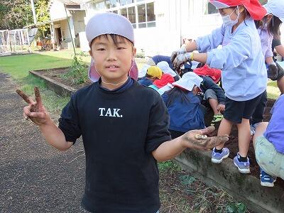 【幼虫・・・。歓声、悲鳴、とってもにぎやかな2年生の芋ほり体験でした。】
