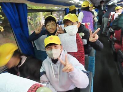 【楽しいバスガイドさんの話にノリノリの子ども達。☝写真は、校歌を歌っているところだそうです。】