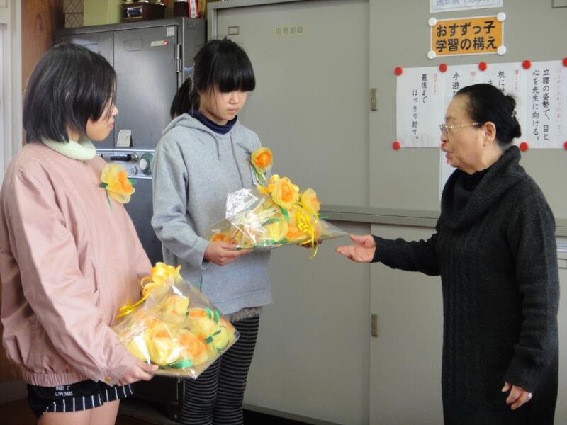 先日、都農町更正保護女性会の皆様が来校され、今年も手作りのコサージュを届けてくださいました。春らしい黄色のかわいいコサージュです。