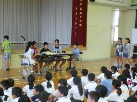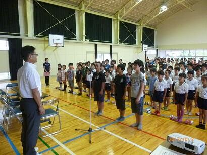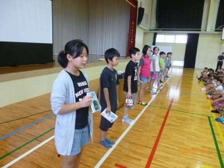 次に、今月の月目標「進んで本を読もう」「外で元気に遊ぼう」につ いて委員会の児童や担当の先生から話がありました。