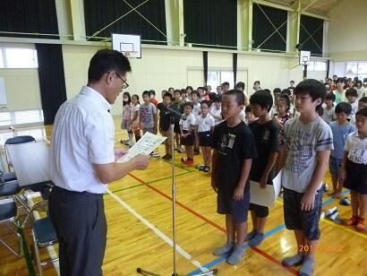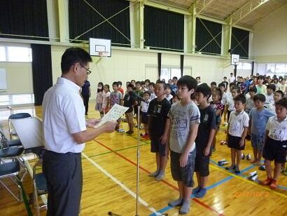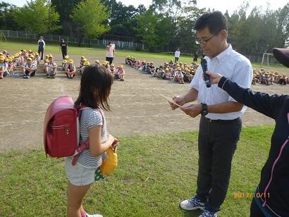 2学期最初の「あいさつ隊長」を全校朝会で表彰しました。