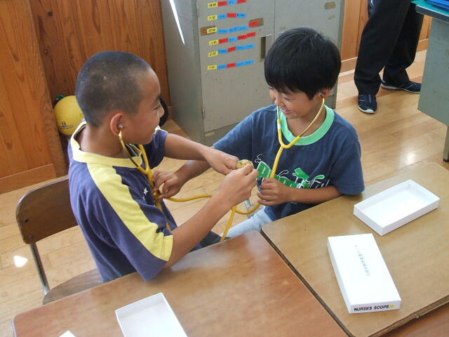 また、聴診器を使って自分の心臓の音や友達の心臓の音を聞き、自分たちも生きていることを実感しました。
