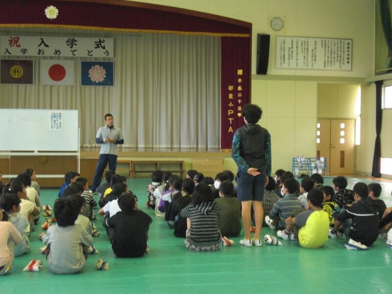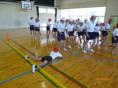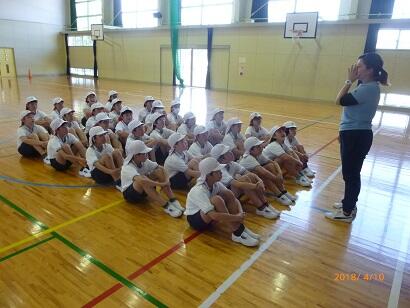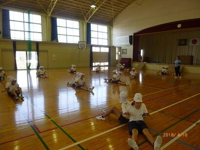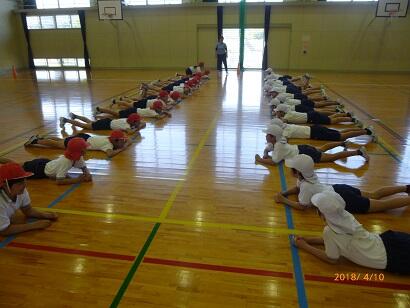 まず初めに、体育の約束やこの1年でできるようになって欲しい運動について説明した後、「体つくり運動」を行っていきました。