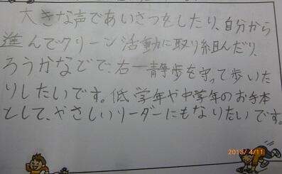 1学期の始業式が行われました。式の中で、校長先生から、進級した子どもたちに今年1年頑張ってほしいことのお話がありました。また、6年生の代表児童が、最高の最上級生になるために頑張ることを発表しました。