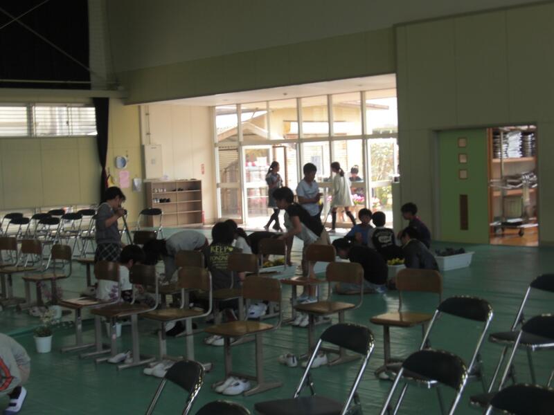 そして、6時間目に、入学式の準備を行いました。4年生から6年生の子どもたちが、分担された場所を一生懸命掃除したり、椅子や机などを並べたりしました。子どもたちの頑張りで、素晴らしい会場や教室ができあがりました。