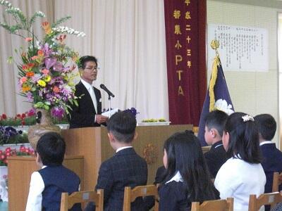 式が始まると、音楽に合わせて、元気よく1年生の子どもたちが入場してきました。担任の先生から新入生一人一人の名前が呼ばれると、たくさんの来賓の方々や保護者の方々、5・6年生や職員の見守る中で、元気よく「はいっ!」と大きな返事をして立つことができました。来賓の方々や校長先生からたくさんのお祝いの言葉をいただきました。また、6年生からは、都農小学校の様々な行事や楽しいことの発表があり、1年生の子どもたちは今日から始まる小学校生活をとても楽しみにしている様子でした。