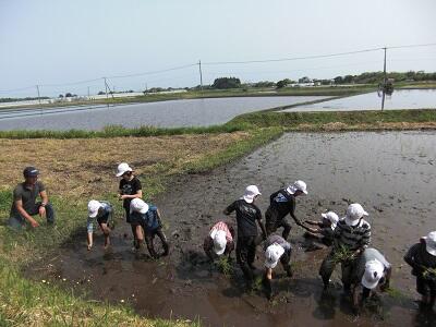 最初に、植える苗の本数や植える場所など、植え方の説明を聞き、いざ田んぼの中へ。とても暑い日でしたが、田んぼの中の水は冷たく、田んぼに入った瞬間、たくさんの所から悲鳴が上がっていました。最初は、自分の目の前の一ヶ所に苗を植えるのに長い時間がかかっていた子どもたちでしたが、植え進めるにしたがって、だんだんとコツをつかみ、早く、そして上手に植えることができるようになっていきました。