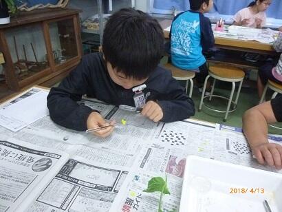 【ピンセットと虫めがねを使い、細かく観察する子どもたち】