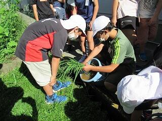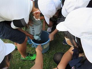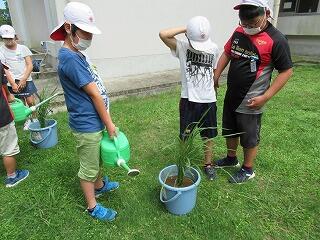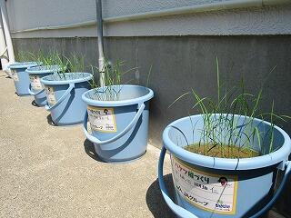 5年生の総合的な学習の時間(きらら)では、お米について調べています。今年は新型コロナウイルス感染症の影響で、楽しみにしていた田植えができませんでした。そこで、JAの方からバケツ稲づくりセットをいただき、バケツの中で米づくりに挑戦しています。