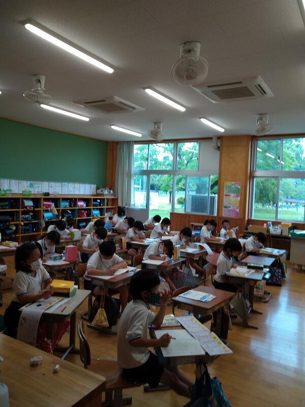 例年より半月近く早い梅雨入りで、どんよりとした空が続いています。県内山間部の一部では今朝がた、大雨警報が出ていました。被害がないことを心から願っています…本町は登校時間は何とか雨は降らなかったものの、その後降雨があり、外で予定していた活動は延期となりました。ただ南寄りの風が強く、湿度も高く、今年度初めて空調を使って学習に取り組みました。感染症対策で換気はしっかり行いながら、扇風機も効果的に使いながら、環境にも配慮しました。今後は熱中症計測器を確認しながら、命最優先の活動をしていきます。暑さに負けない体力をつけるためにも、日頃から規則正しい生活、「早寝早起き朝ごはん」に心がけていきましょう。(下の写真は1階渡り廊下にある熱中症計測器と空調の中で真剣に学習に励んでいる3年生の様子です)