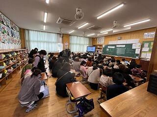 6年生とのお別れ集会を体育館で行いました。前半は、4年生の進行のもと各学年から6年生へ向けてのメッセージや歌のプレゼントやクイズ等で楽しく過ごしました。後半は、5年生の計画委員会が考えてくれた交流活動で、じゃんけんゲームや丸罰ゲームを楽しみました。お世話をしてくれた4年・5年の代表の皆さんありがとう。