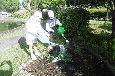 【サツマイモ畑に水やりをする4年生。都農小は全学年をとおして、栽培活動が盛んに行われています。】