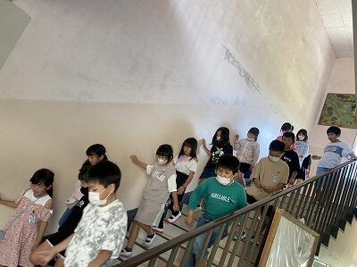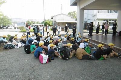 放送の合図で児童避難・・・。少し、笑い声や声が聞こえてきたのが残念です。(写真の学年は、とても静かに避難できました。)