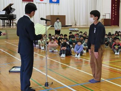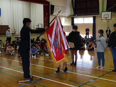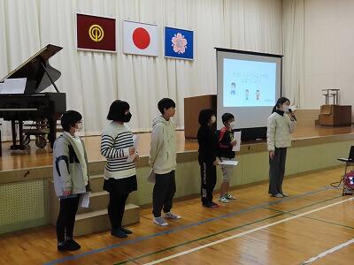 【校歌斉唱:寒い体育館、手がかじかむ中、とても上手に演奏できました。(冬休み中、たくさん練習したのでしょうね!)】