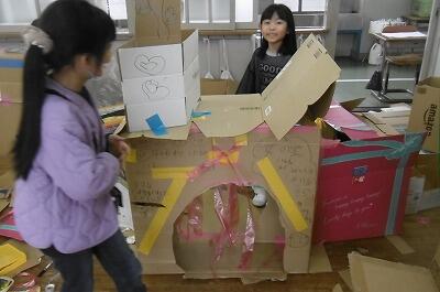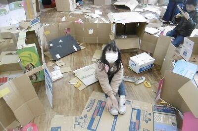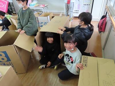 めあて「ダンボールに入ったり、大きさを考えたりしながら作ってみよう」
