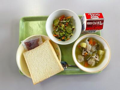 今日の「肉団子と野菜のコンソメ煮」には、レンコン、じゃがも、玉ねぎ、にんじん、しめじ、いんげんなどたくさんの野菜が入っていました。「チーズサラダ」にもきゅうり、ブロッコリー、キャベツ、にんじん…とたっぷりの野菜が入っていました。バランスの取れた美味しい給食に感謝!!
