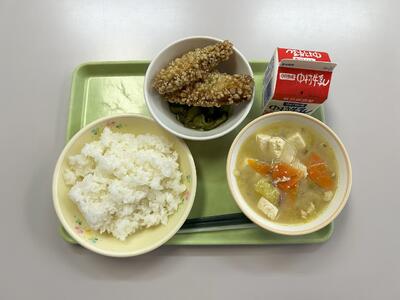 今日はホキの切り身に天玉の衣をつけて揚げた天玉揚げを出しています。パン粉とはまた違った衣の食感も楽しんでくださいね。