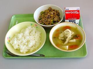 今日使用している宮崎県産の食材は、米、牛乳、ごぼう、豆腐、豚ミンチ、干ししいたけです。宮崎県は肉や魚、野菜、果物などいろいろなものの生産が盛んです。地域の恵みに感謝して、おいしくいただきましょう。そぼろ丼はお好みで、そぼろをごはんにかけて食べてくださいね。