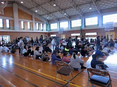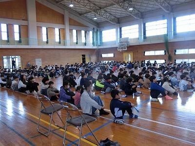 昼休みになりました。体育館には、本校の全校児童約240名の内の半分以上の子どもたちが集まりました。