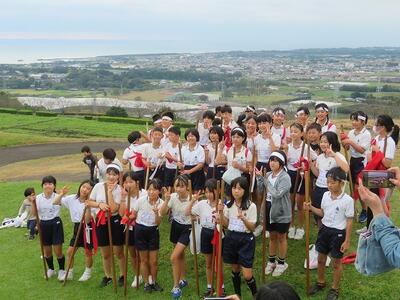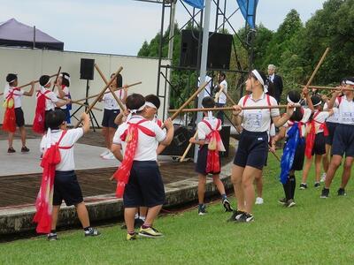 11月10日(日)に都農ワイナリーで収穫祭がありました。その中で、5年生の約30名が運動会でも披露した「篠別府棒踊り」を踊りました。参加可能な児童で、隊形を組み直して練習を行い、参加しました。今回は、鼻筋のところに「おしろい」を塗り、気持ちを高めました。初めて踊る場所でしたので、緊張しながらも、楽しそうな表情で、「入場」「4人棒」「6人棒」を披露しました。終了後、会場に来ていた多くの方々からたくさんの拍手をいただきました。雨が心配されましたが、踊り終わるまではなんとか持ちこたえることができてよかったです。指導をしてくださった篠別府地区棒踊り保存会の方々や、送迎してくださった保護者の方々に感謝申し上げます。ありがとうございました。
