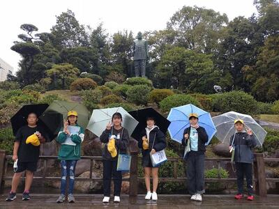 午前中に班別自主研修が行われました。雨が降ったりやんだりの天候の中、班ごとに鹿児島中央公園付近を散策しました。黎明館やメルヘン館などを自分子ども達だけで巡りました。写真は、西郷隆盛像の前の様子です。楽しそうな様子が表情からうかがえます。