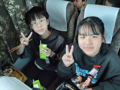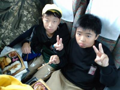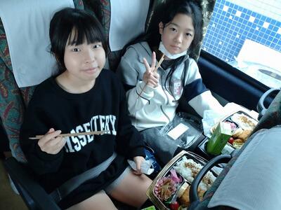 班別自主研修を終え、昼食の時間。今回は、バスの中でのお弁当。とてもおいしそうです。ボリュームがありますね。窓の外には、桜島が見えます。お天気も回復しているようです。子ども達は、この後の最終見学地の「いおワールドかごしま水族館」の見学をとても楽しみにしています。