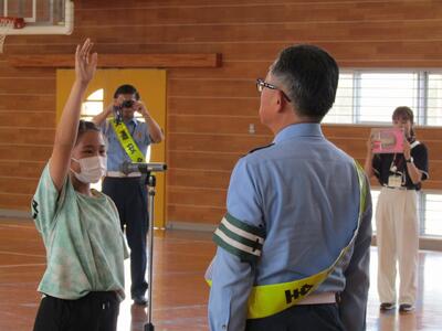 6月11日(水)にハンドアップマイスター任命式が行われました。この任命式は、横断歩道での事故を防ごうという目的で行われました。会場の体育館には、坂田都農町長や高鍋警察署長、中西教育長もお越しいただき、本校からは児童代表の6年生が参加しました。坂田町長や高鍋警察署長のあいさつが行われた後、代表児童2名が任命証書を受け取りました。次に、代表児童が宣誓を堂々と行いました。