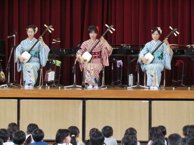 6月12日(水)の3・4校時に、都農南小・東小合同の鑑賞教室を南小の体育館で行いました。今回の鑑賞教室は、村上三弦道によります三味線を中心とした音楽鑑賞教室でした。目の前で繰り広げられた生の三味線の演奏の迫力に子ども達は釘付けでした。途中の場面では、代表児童が阿波踊りのリズムに乗って踊ったり、実際に三味線の演奏をしたりなどの場面があり、会場が一層盛り上がりました。子ども達にとって、とても有意義な時間となりました。今後も、このような機会を設け、都農南小学校の子ども達の情操教育を推進することができましたら幸いです。