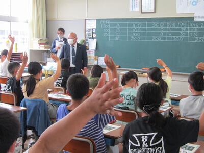 税理士の方2名が税に関する講話をしてくださいました。その中で、税金がなくなったらどのような世の中になるのかということについて映像を通して学びました。普段、当たり前の風景となっているゴミの収集や警察や消防の活動等が全て有料となり、住みにくい世の中になることを6年生の子ども達が学んでいました。その後、税金の種類についても学習しました。今回の学びを通して、将来の納税者としての義務をきちんと果たしてくれる大人になることでしょう。