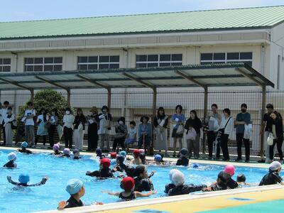 7月3日(水)に1年生が生活科で砂遊びを行いました。天候に恵まれ、夏空の中での実施でした。山や川を作ったり、水をためて遊んだりなど、とても楽しそうでした。砂遊びの後に水泳の学習が組んであり、多少汚れても平気な様子の子ども達でした。砂遊び後の水泳の時間も水中に潜り、宝探しをするなどとても楽しそうに過ごす1年生でした。