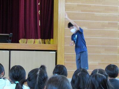 初めに、3年生の児童代表が作文を発表しました。1学期を振り返りながら、「家庭での勉強をがんばったこと」「給食を時間内に食べきれるようになったこと」「習い事の陸上をがんばったこと」など、自分自身の成長した姿について堂々と述べることができました。