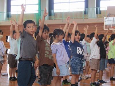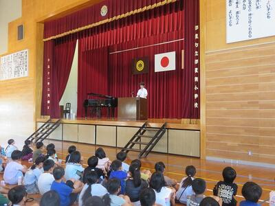 次に校長が話をしました。初めに、始業式の日に話した内容について子ども達とともに振り返りました。「自分の命は自分で守ること」「自分がされて嬉しいことを友達にすること」「自分が知っている人に、笑顔で、相手に届く声で、気持ちを込めてあいさつをすること」などについてです。子ども達は、それぞれの心の中でしっかり振り返ることができたことと思います。その後、「夏休みは、家族と過ごす時間が多いので、お手伝いをたくさんすること」「できるだけ地域の行事に参加すること」「夏休みであっても、早寝早起き、食事をきちんと取って、心身ともに健康に過ごすこと」についての話を行いました。