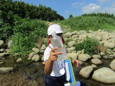 川に着くと、まずは川の周辺や水質について調べました。目で見た様子や匂い、音など五感を働かせて観察を行いました。持ってきたペットボトルなどに水を入れ、熱心に観察を行っていました。その後、水生生物の調査に移りました。最初は、水生生物を捕ることができなかった子ども達でしたが、こつをつかみ始めるとテナガエビやカニ、小魚などをたくさん捕まえていました。普段なかなかできない体験に大はしゃぎの子ども達でした。捕まえた生き物をしっかり観察し、水辺調査は終了しました。今回、地元の名貫川を調査することにより、水質の美しさやその中に住む水生生物の豊富さなどを実感し、そのことが郷土愛や自然への関心に繋がることと思います。