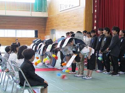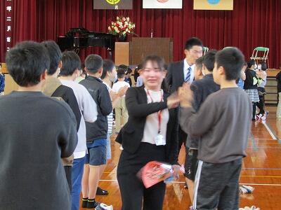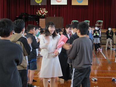 3月29日(金)に離任式を行いました。本校からは、6名の職員が離任し、新任地に向かうことになりました。離任式では、職員一人一人が子ども達に思いを告げました。子ども達は、職員の話にしっかりと耳を傾け、これまでの思い出を心の中に描いているようでした。代表児童が挨拶を行った後、花束が贈呈されました。職員の中には感極まり、涙ぐむ場面もありました。離任する6名の職員は、子ども達や留任する職員からのたくさんの拍手に包まれながら体育館を後にしました。