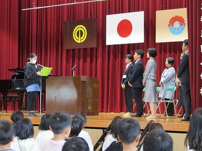 4月8日に新任式を行いました。今年度の新任式では7名の職員の紹介が行われました。子ども達は、新しく出会う先生方をキラキラした目で見つめていました。新任者は、一人ずつ自己紹介を含めそれぞれの思いを伝えました。その後、新6年生児童が歓迎の言葉を述べました。たくさんの拍手で新しい職員を迎え、温かな雰囲気で新任式を終えました。