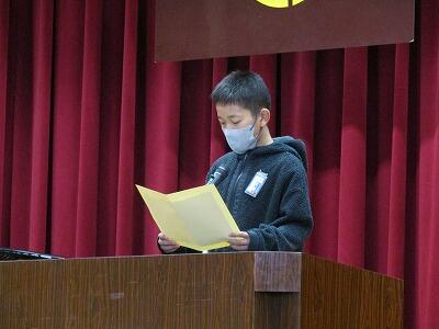 3月26日(火)に修了式を行いました。1年生から5年生が参加しました。まず初めに、1年生の2名が作文発表を行いました。1年間でできるようになったことや頑張ったことを発表しました。「あいさつ」「学習」「縄跳び」「送別行事のウォークラリー」等を通した成長がうかがえました。そして、2年生での目標についても述べ、来年度への意気込みが感じられました。