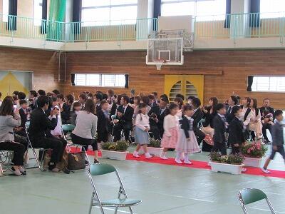 まず初めに、新入生入場。入学式用の服に身を包み、入場した新入生。その表情は、嬉しそうだったり、恥ずかしそうだったり様々でした。入場を終え、氏名点呼の場面では、元気いっぱい返事を行っていました。これまでたくさん練習をしてきたのでしょう。教科書授与の場面では、代表児童が前日の練習の成果を発揮し、きれいなお辞儀と受け取りを披露してくれました。その後、校長の話、教育委員会の話、来賓お祝いの言葉などが行われ、それぞれの話をしっかり聞いていました。