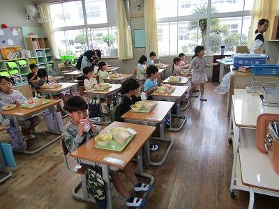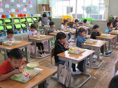 4月15日(月)は、入学した1年生の初めての給食でした。メニューは、ご飯、牛乳、ポークカレー、キャベツのサラダ、お祝いデザートでした。1年生の子ども達は、目の前に運ばれてきた初めての学校給食に目をキラキラさせながら食べる時間を待ちました。そして、「いただきます。」の号令とともに、「おいしいね。」と言いながら次々に給食を口に入れていました。中には、おかわりをする子どももいました。デザートまで食べると大満足の様子でした。この給食の時間が、子ども達にとって毎日楽しい時間になりますように!