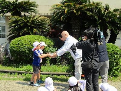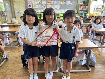 5月8日(水)に、野菜の苗の贈呈式が行われました。ジェイエイ・アグリシード株式会社より、きゅうり、ピーマン、ミニトマトの苗を贈呈していただきました。ジェイエイ・アグリシード株式会社の方からは、「野菜を育てる楽しさや収穫の喜びを知り、農業に関心をもってほしい」というメッセージが子ども達に贈られました。苗をいただいた2年生の児童は大喜び。今後プランターに苗を移し、収穫の日を楽しみにしながら、日々のお世話を頑張ってくれることでしょう。