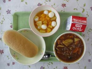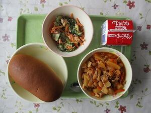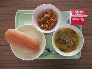 背割りパン 牛乳 チンゲン菜のスープ ドライカレー 629Kcal