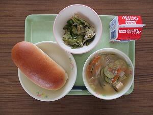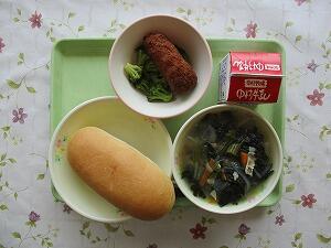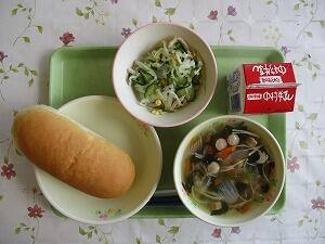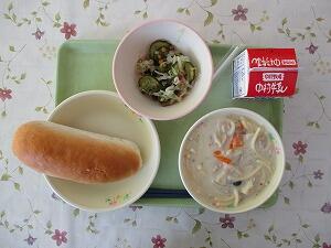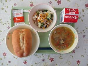 ミルクパン 牛乳 肉団子のスープ 野菜とささみのサラダ 555Kcal