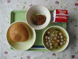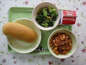 ミルクパン 牛乳 じゃがいもと豆のミートソース煮 ブロッコリーの胡麻和え 672Kcal