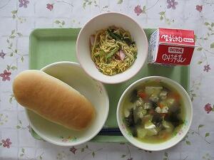 コッペパン 牛乳 鶏とわかめのスープ 冷やし中華 530Kcal