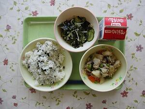 わかめごはん 牛乳 里芋のそぼろ煮 胡麻酢和え 572Kcal