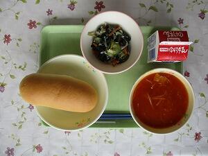 コッペパン 牛乳 トマト鍋 海藻サラダ 485Kcal