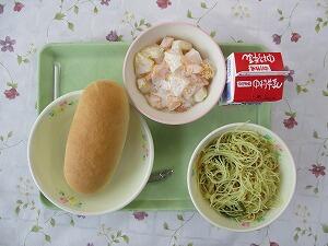 マヨネーズパン 牛乳 里芋のスープ 花野菜とツナのサラダ ミルメークコーヒー 677Kcal