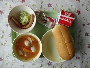 背割りパン 牛乳 オニオントマトスープ ウインナーのソースかけ ゆでキャベツ さつまポテト 589Kcal