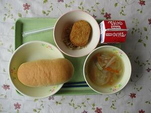 コッペパン 牛乳 千切り野菜のスープ 里芋のコロッケ ゆでもやし(ドレッシング)